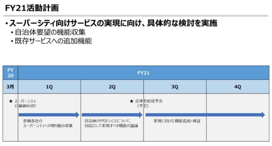 FY20末でスーパーシティ公募が終了し、FY21からは本格的に各自治体がスーパーシティ実現に向けた取り組みを始めることとなる。都市サービス分科会では、参画各社のスーパーシティへの取り組み状況の収集や、会津若松のような先進的な取り組みを行っている自治体の見学会を通し、各自治体の要望を浮き彫りにする。